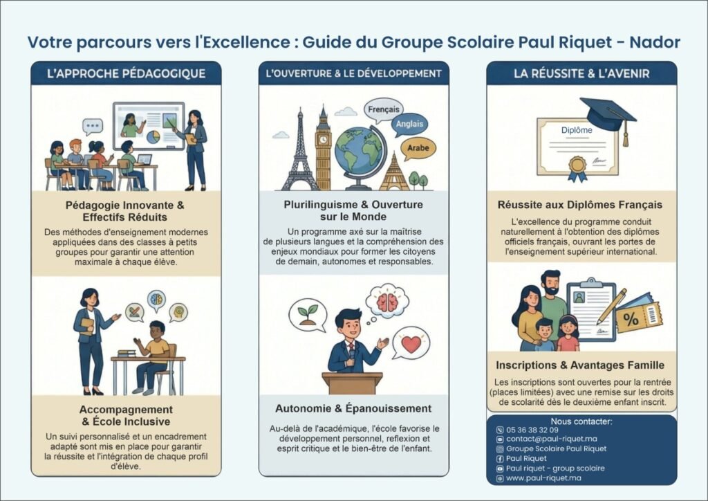 أعلنت مجموعة بول ريكي المدرسية بالناظور عن فتح باب تسجيل التلاميذ الجدد وإعادة التسجيل للعام الدراسي المقبل، وذلك ابتداءً من 13 أبريل 2026، لجميع المستويات من الروض حتى الباكالوريا.
