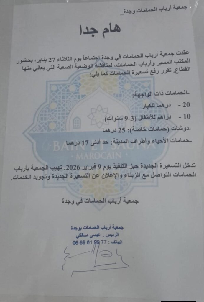 قررت جمعية أرباب الحمامات بوجدة رفع أسعار خدماتها، خلال اجتماع عقدته يوم الثلاثاء 27 يناير الماضي. جاء القرار بحضور المكتب المسير وأرباب الحمامات لمناقشة الوضعية الصعبة التي يواجهها القطاع. تدخل التسعيرة الجديدة حيز التنفيذ ابتداءً من 9 فبراير 2026.