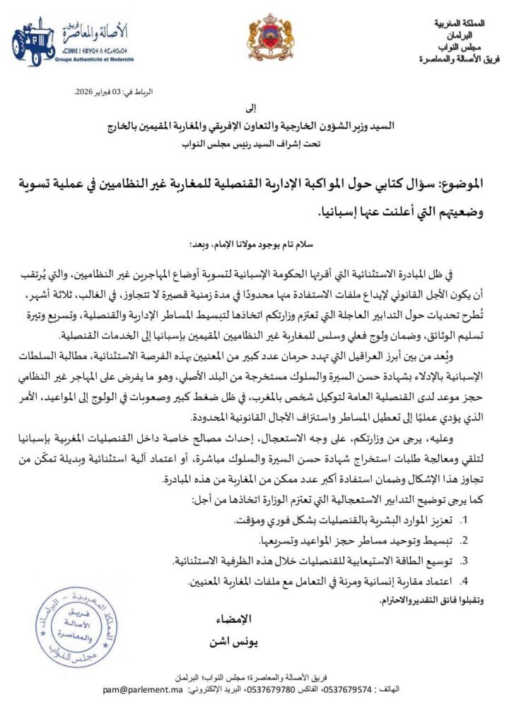 يُذكر أن هذا السؤال الاستعجالي يعكس استمرار الترافع من داخل المؤسسة التشريعية دفاعاً عن المغاربة المقيمين بالخارج، وضمان مواكبة إدارية فعالة وسلسة للمغاربة غير النظاميين المقيمين بإسبانيا في عملية التسوية المعلن عنها.