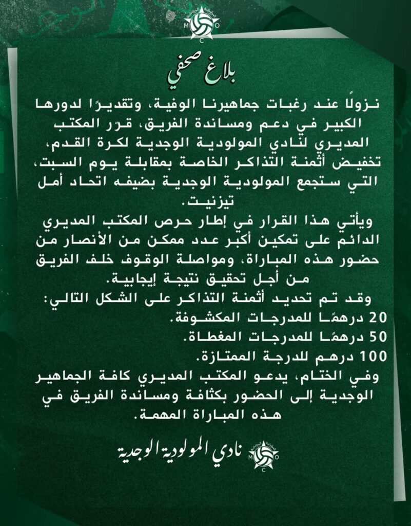 وفي ختام البلاغ، دعا المكتب المديري كافة جماهير المولودية الوجدية إلى الحضور بكثافة ومساندة الفريق في هذه المباراة.