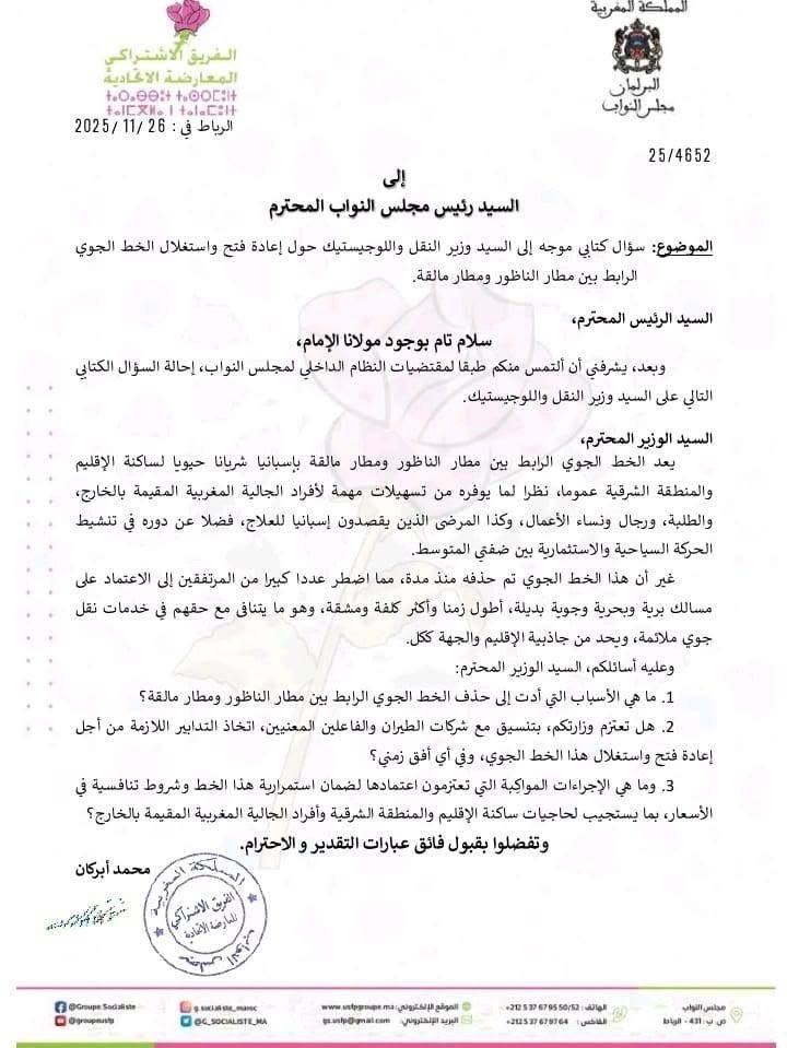 وجّه البرلماني الاتحادي محمد أبركان سؤالين كتابيين إلى وزير النقل واللوجستيك حول الخط الجوي الناظور–مالقة، الذي يشكّل محوراً مهماً لحركة التنقل بين الجهة الشرقية والجنوب الإسباني. ويُعتبر هذا الربط الجوي مساراً أساسياً استُعمل لسنوات من طرف ساكنة الإقليم والجالية المغربية المقيمة بالخارج، إلى جانب دوره في تنشيط الحركة السياحية وتسهيل المبادلات الاقتصادية بحكم الروابط التاريخية والاجتماعية بين الجهتين.