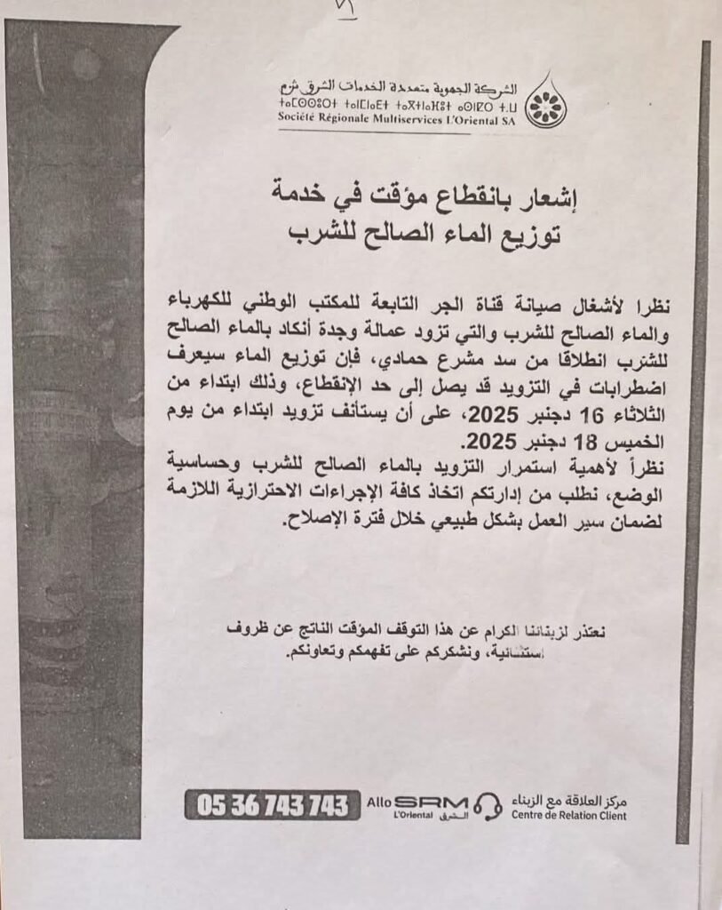 أعلنت الوكالة الجهوية متعددة الخدمات لجهة الشرق ش.م (قطاع الماء الصالح للشرب)، عن تسجيل انقطاع مؤقت في خدمة توزيع الماء الصالح للشرب بمدينة وجدة، وذلك بسبب أشغال صيانة مبرمجة بقناة الجر التابعة للمكتب الوطني للكهرباء والماء الصالح للشرب.