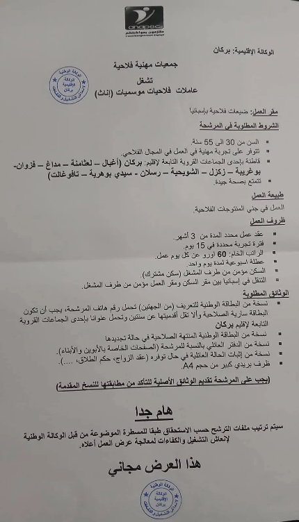 أعلنت الوكالة الإقليمية للتشغيل بإقليم بركان عن فتح باب الترشيح أمام العاملات المغربيات الراغبات في الاستفادة من فرص تشغيل موسمية داخل الضيعات الفلاحية بإسبانيا، وذلك في إطار عقود عمل موسمية محددة المدة تمتد لثلاثة أشهر. ويأتي هذا العرض في سياق برامج التشغيل الخارجي المؤطرة قانونياً، والتي تهدف إلى تمكين فئات من اليد العاملة القروية من ولوج فرص شغل مؤقتة في القطاع الفلاحي، وفق شروط مضبوطة ومعلنة سلفاً.