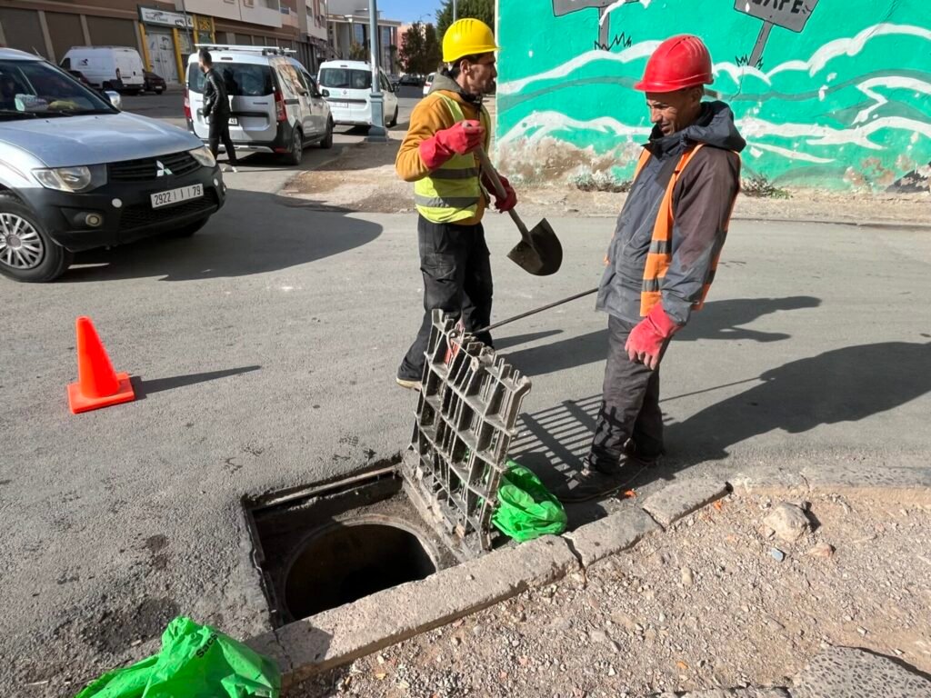 وفي هذا السياق، شملت التدخلات الميدانية تنقية وصيانة شبكة الصرف الصحي بحيي المير علي وسي لخضر بمدينة وجدة، حيث جرى تنظيف بالوعات الصرف الصحي وإزالة الأوحال والنفايات العالقة داخل القنوات، التي تُعد من بين الأسباب الرئيسية لانسداد الشبكة خلال فترات التساقطات المطرية القوية، وما قد ينجم عنها من اختناقات موضعية.